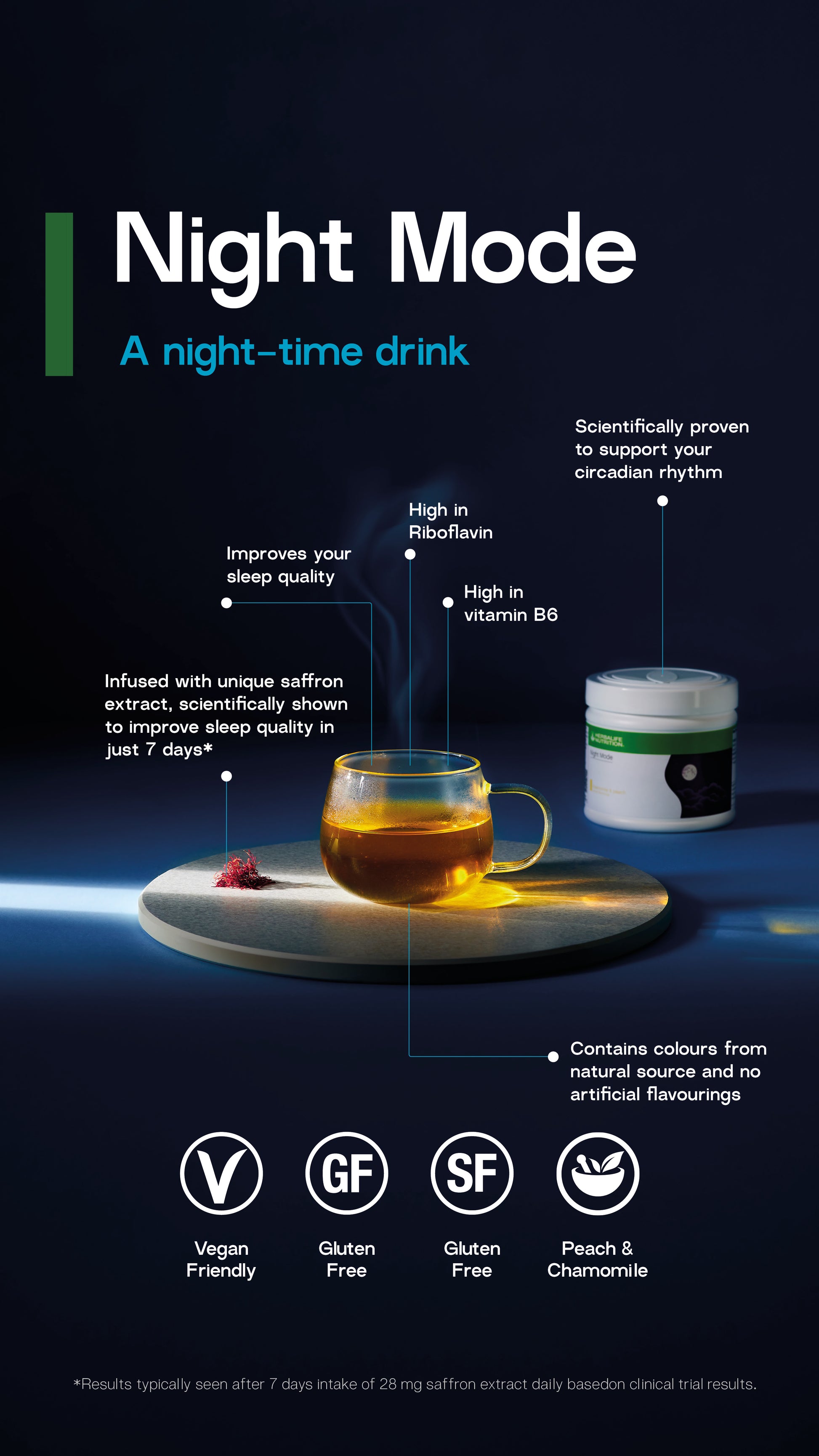 7 days* to better sleep with Herbalife Night Mode. A night-time drink infused with a unique saffron extract, scientifically shown to improve sleep quality in just 7 days*. Saffron extract can also improve your mood after awakening and increase your evening melatonin levels that supports your sleep/wake cycle** The saffron extract in Night Mode will also help reduce sleeplessness**, while getting good sleep at night leaves you feeling refreshed upon waking up.